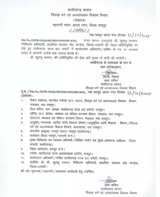 सरकार द्वारा जारी आदेश में कहा गया है कि डॉ. खुशबू उस्मान, जो वर्तमान में धमतरी जिले के प्राथमिक स्वास्थ्य केंद्र कण्डेल में चिकित्सा अधिकारी के पद पर सेवा दे रही थीं, उनकी सेवाओं को प्रतिनियुक्ति पर लेते हुए उन्हें छत्तीसगढ़ राज्य हज कमेटी में कार्यपालन अधिकारी/सचिव के पद पर पदस्थ किया गया है। उनकी प्रतिनियुक्ति से संबंधित विस्तृत सेवा शर्तें बाद में अलग से जारी की जाएंगी।