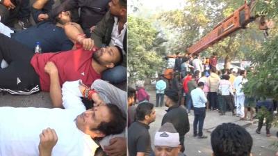 रायपुर में चौपाटी हटाने का मामला, पूर्व विधायक ने सड़क पर लेटकर किया विरोध